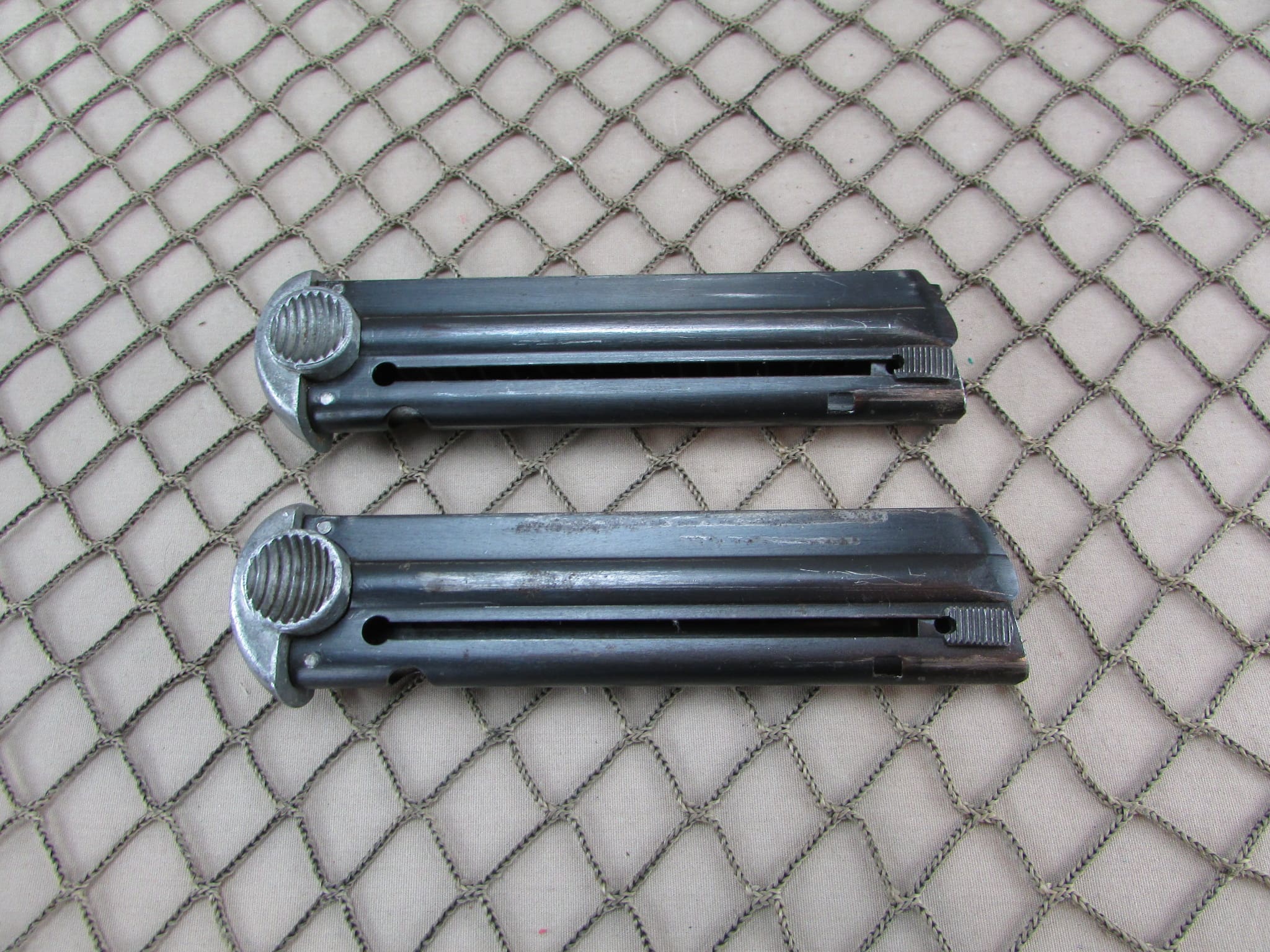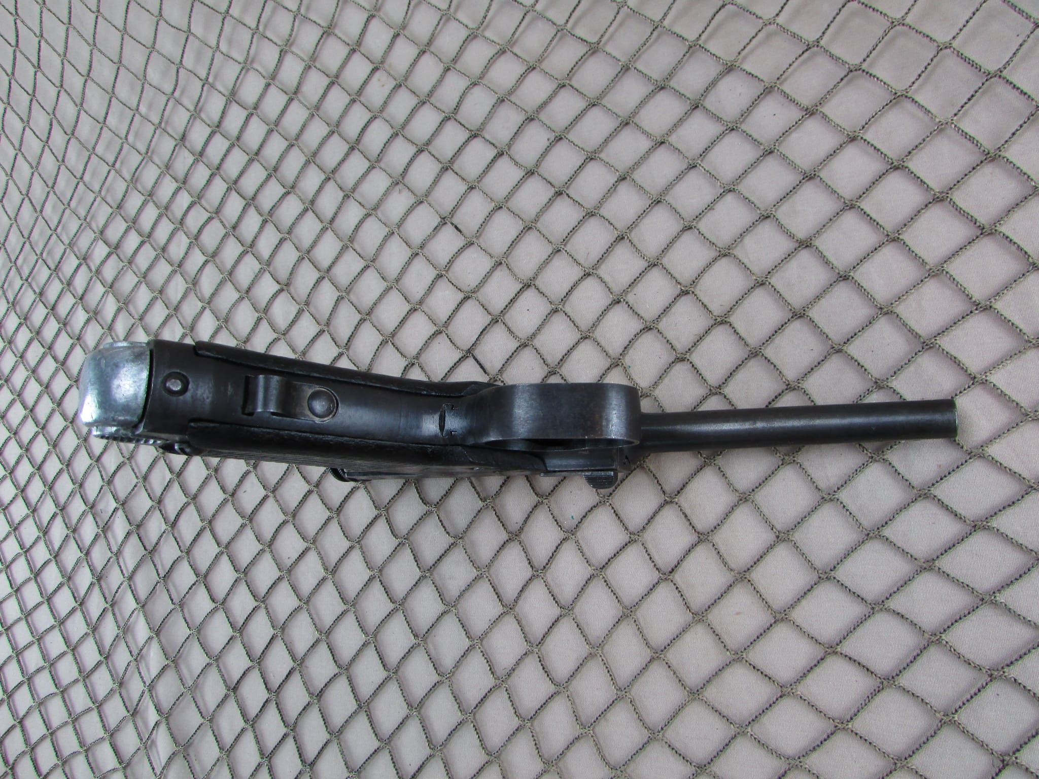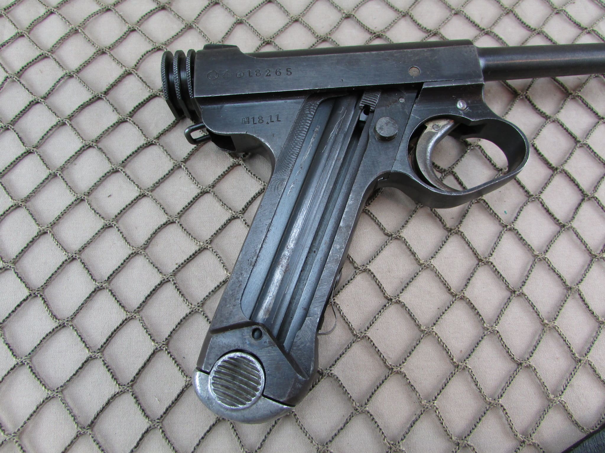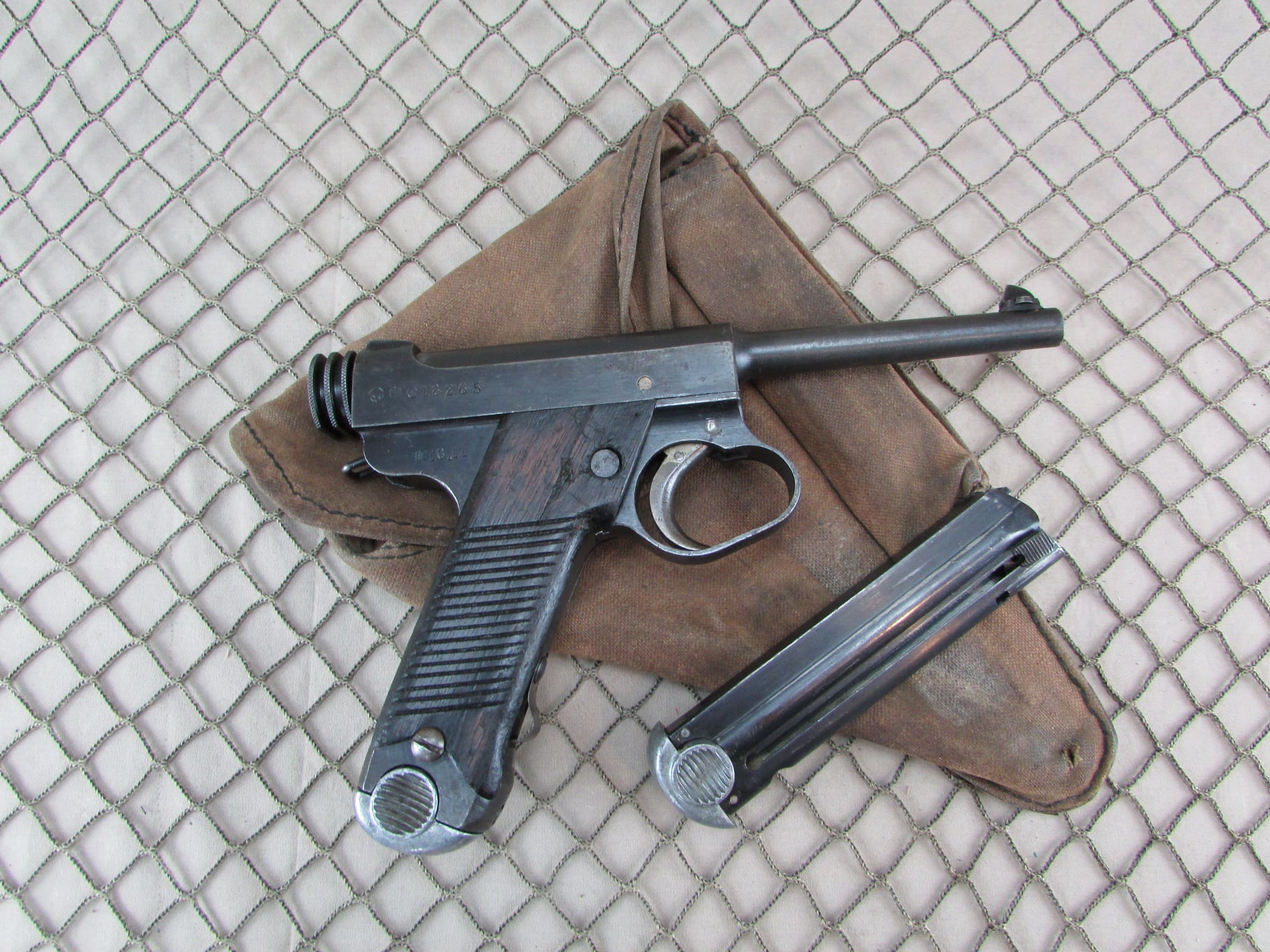 We are offering a 1943 production, Japanese Type 14 Nambu Pistol made by the Kokubunji factory under the supervision of the Nagoya arsenal. It is in overall excellent condition, with very good bore, but slight roughness toward the muzzle. Appears to be all matching including the frame, bolt, trigger, and two magazines, although the grips are unmarked. Includes canvas holster. No import marks.