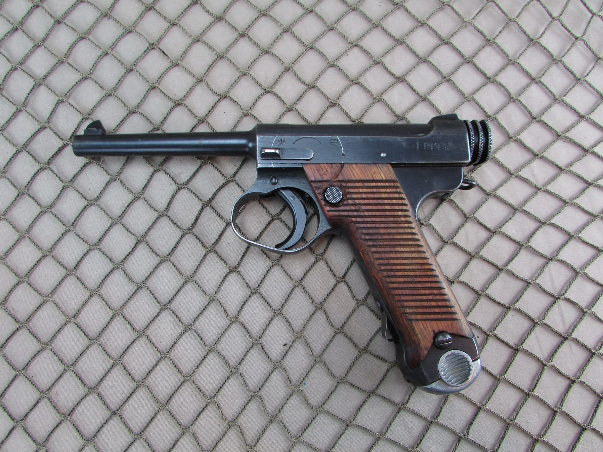 Nambu Type 14 semi-automatic pistols are the standard-issue sidearm for the Imperial Japanese Army during World War II. Chambered in 8mm Nambu, this piece showcases historical wartime manufacturing with wooden grip panels and unique striker-fired operation. A desirable piece for collectors of WWII firearms or Japanese military memorabilia. Its historical significance makes it a standout for display or collection.