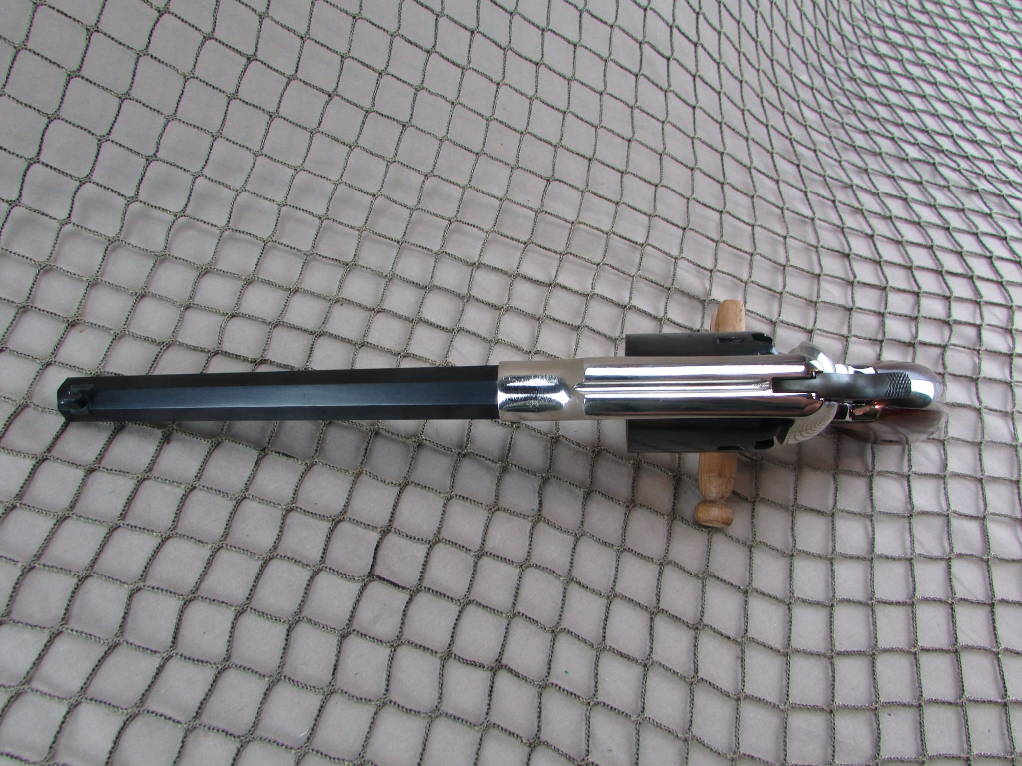 This Italian made reproduction 1858 New Army black powder revolver chambered in .44 caliber. It features a striking two-tone finish with a polished steel frame and a blued octagonal barrel. The revolver includes a classic wood grip and an 8-inch barrel for improved accuracy. It’s an excellent reproduction of the Civil War-era Remington design and is perfect for historical reenactors or black powder shooting enthusiasts. The firearm appears to be in excellent condition with no visible signs of wear or corrosion.
