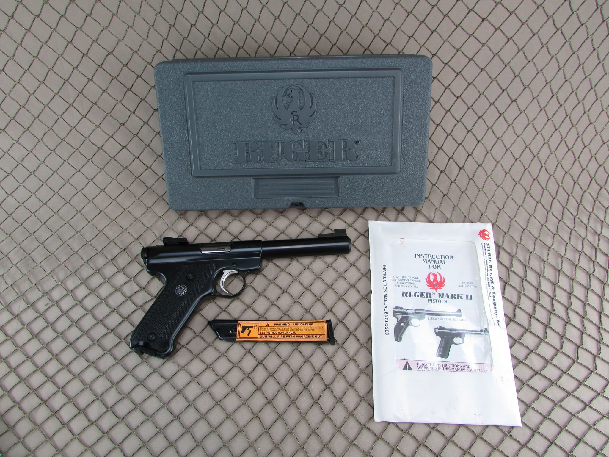 Excellent condition Ruger target pistol with an excellent bore.  Includes original box, manual, and two factory mags.